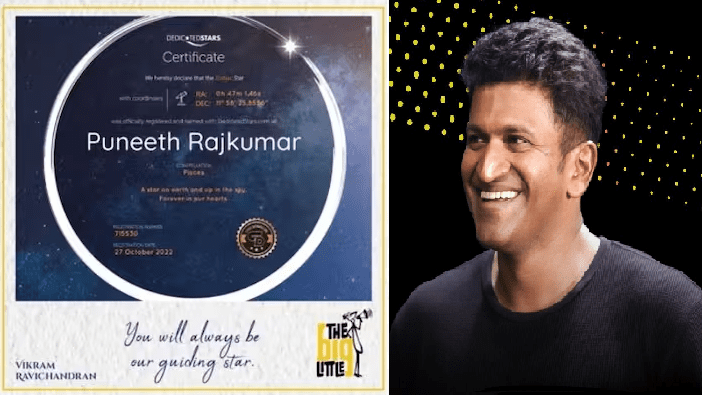 ಕನ್ನಡಿಗರ ಹೃದಯದಲ್ಲಿ ಧ್ರುವ ನಕ್ಷತ್ರವಾಗಿರುವ ಪುನೀತ್, ಈಗ ಆಕಾಶದಲ್ಲಿ ಅಕ್ಷರಶಃ ನಕ್ಷತ್ರವಾಗಿದ್ದಾರೆ. ಮೀನ ರಾಶಿಯ ನಕ್ಷತ್ರಪುಂಜದಲ್ಲಿ ಕಾಣಸಿಗುವ ನಕ್ಷತ್ರವೊಂದಕ್ಕೆ ‘ಪುನೀತ್ ರಾಜ್ಕುಮಾರ್’ ಎಂದು ನಾಮಕರಣ ಮಾಡಲಾಗಿದೆ. ಮಾರ್ಚ್ 17, ಪವರ್ ಸ್ಟಾರ್ ಪುನೀತ್ ರಾಜ್ಕುಮಾರ್ ಅವರ ಜನ್ಮದಿನೋತ್ಸವ. ಪುನೀತ್ ಹುಟ್ಟು ಹಬ್ಬದ ಪ್ರಯುಕ್ತ ಬಿಗ್ ಲಿಟ್ಲ್ ಕಂಪನಿ ನಟ ವಿಕ್ರಮ್ ರವಿಚಂದ್ರನ್ ಅವರೊಂದಿಗೆ ಸೇರಿ ವಿಡಿಯೋ ಗೌರವ ಸಲ್ಲಿಸಿದೆ. ನಟ ವಿಕ್ರಮ್ ರವಿಚಂದ್ರನ್ ಅವರೊಂದಿಗೆ ಬಿಗ್ ಲಿಟ್ಲ್ ಕಂಪನಿ ನಕ್ಷತ್ರಕ್ಕೆ ಶಾಶ್ವತವಾಗಿ ಪುನೀತ್ ರಾಜ್ಕುಮಾರ್ ಹೆಸರಿಟ್ಟಿದೆ.