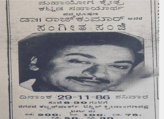 ಡಾ.ರಾಜ್ ಕುಮಾರ್ ಅವರ ಒಂದು ಸಂಗೀತ ಸಂಜೆ ಕಾರ್ಯಕ್ರಮಕ್ಕೆ 200 ರೂ. ಟಿಕೆಟ್ ದರ ಇತ್ತಾ..? ಹೌದು ಎನ್ನುತ್ತಿದೆ ಒಂದು ಪೋಸ್ಟರ್. 1986ರ ನವೆಂಬರ್ 29ನೇ ತಾರಿಕು ನಡೆದಿದ್ದ ಸಂಗೀತ ಸಂಜೆ ಕಾರ್ಯಕ್ರಮಕ್ಕೆ ಸಾವಿರಾರು ಜನ ನೂರಾರು ರೂ. ದರ ಕೊಟ್ಟು ಟಿಕೆಟ್ ಖರೀದಿಸಿ, ಸಂಗೀತ ಸಂಜೆಗೆ ಬಂದಿದ್ದರು. ಕಾರ್ಯಕ್ರಮ ನಡೆದಿದ್ದ ಜಾಗ ಕಬ್ಬನ್ ಪಾರ್ಕ್. ಹೀಗೆ 1986ರಲ್ಲಿ ಡಾ.ರಾಜ್ಕುಮಾರ್ ನಡೆಸಿಕೊಟ್ಟ ಸಂಗೀತ ರಸ ಸಂಜೆ ಕಾರ್ಯಕ್ರಮದ ಜಾಹೀರಾತೊಂದು ವೈರಲ್ ಆಗಿದೆ. ಈ ಜಾಹೀರಾತಿನಲ್ಲಿ ಡಾ.ರಾಜ್ ಕುಮಾರ್ ಮ್ಯೂಸಿಕ್ ಕಾನ್ಸರ್ಟ್ ಟಿಕೆಟ್ ದರವೂ ಬಹಿರಂಗವಾಗಿದೆ. ಕಬ್ಬನ್ ಪಾರ್ಕ್ ಟೆನ್ನಿಸ್ ಕ್ರೀಡಾಂಗಣದಲ್ಲಿ ಡಾ.ರಾಜ್ಕುಮಾರ್ ಸಂಗೀತ ಸಂಜೆ ಕಾರ್ಯಕ್ರಮ ಆಯೋಜಿಸಲಾಗಿತ್ತು.