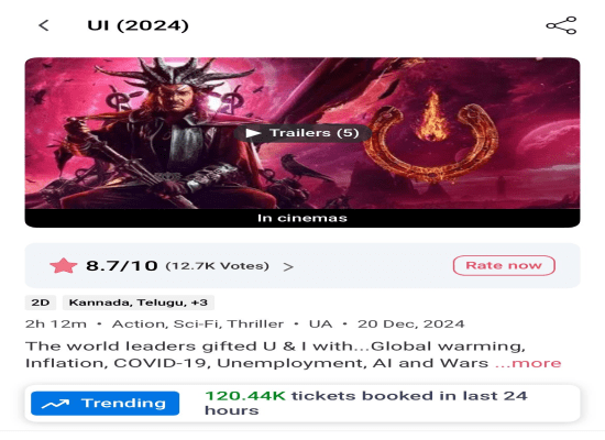 ಇನ್ನು ಯುಐ ಓಪನಿಂಗ್, ಕಾಟೇರ ಚಿತ್ರದ ದಾಖಲೆ ಬ್ರೇಕ್ ಮಾಡಿದೆ. ಕಾಟೇರ ಚಿತ್ರವನ್ನು ರಿಲೀಸ್ ಆದ ಮೊದಲ ದಿನ 1 ಲಕ್ಷದ 4 ಸಾವಿರ ಪ್ರೇಕ್ಷಕರು ನೋಡಿದ್ದರು. ಯುಐ ಸಿನಿಮಾ ನೋಡಿದವರ ಸಂಖ್ಯೆ 1 ಲಕ್ಷ, 9 ಸಾವಿರ. ಮೊದಲ ದಿನ 18 ಕೋಟಿ ಕಲೆಕ್ಷನ ಆಗಿದ್ದು, ಎರಡನೇ ದಿನ 19 ಕೋಟಿ ಕಲೆಕ್ಷನ್ ಆಗಿದೆ. ಯುಐ ಸಿನಿಮಾವನ್ನು 2ನೇ ದಿನ ನೋಡಿದವರ ಸಂಖ್ಯೆ 1 ಲಕ್ಷದ 20 ಸಾವಿರ ದಾಟಿದೆ. ಎರಡನೇ ದಿನದಲ್ಲಿ ಥಿಯೇಟರ್ ಸಂಖ್ಯೆ ಹೆಚ್ಚಾಗಿದೆ. ಶೋಗಳ ಸಂಖ್ಯೆ ಹೆಚ್ಚಿಸಲಾಗಿದೆ. ಬಹುತೇಕ ಕಡೆ ಯುಐ ಹೌಸ್ಫುಲ್ ಪ್ರದರ್ಶನ ಕಾಣುತ್ತಿದೆ.
