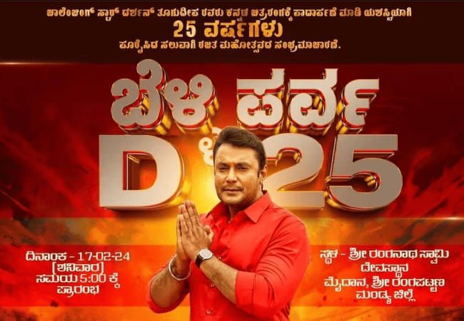 ಚಿತ್ರರಂಗಕ್ಕೆ ಕಾಲಿಟ್ಟು 25 ವರ್ಷ ಪೂರೈಸುವುದೆಂದರೆ ಸುಮ್ಮನೆ ಮಾತಲ್ಲ. ದರ್ಶನ್ ಅವರು ಅಂತಹ ಬೆಳ್ಳಿ ಹಬ್ಬದ ಸಂಭ್ರಮದಲ್ಲಿದ್ಧಾರೆ. ಆ ಸಂಭ್ರಮಕ್ಕೆ ಅಭಿಮಾನಿಗಳು ಶ್ರೀರಂಗಪಟ್ಟಣದಲ್ಲಿ ಆಯೋಜನೆ ಮಾಡಿದ್ದ ‘ಬೆಳ್ಳಿ ಪರ್ವ ಡಿ-25’ ಹಲವು ಅಚ್ಚರಿಯ ಕ್ಷಣಗಳಿಗೆ ಸಾಕ್ಷಿಯಾಗಿದೆ.