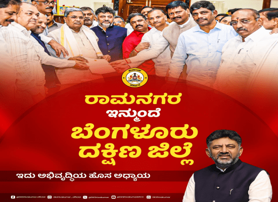‘ರಾಮನಗರ ಜಿಲ್ಲಾ ಕೇಂದ್ರವಾಗಿಯೇ ಮುಂದುವರೆಯಲಿದೆ. ಕೇವಲ ಜಿಲ್ಲೆಯ ಹೆಸರನ್ನು ಮಾತ್ರ ಬೆಂಗಳೂರು ದಕ್ಷಿಣ ಎಂದು ಮರು ನಾಮಕರಣ ಮಾಡಲಾಗಿದೆ. ಈ ಬಗ್ಗೆ ಶೀಘ್ರ ಆದೇಶ ಹೊರ ಬೀಳಲಿದೆ. ಇನ್ನು ಮುಂದೆ ನನ್ನನ್ನು ಬೆಂಗಳೂರು ದಕ್ಷಿಣ ಜಿಲ್ಲೆಯವನು ಎಂದು ಹೇಳಿದ್ದಾರೆ ಡಿಕೆ ಶಿವಕುಮಾರ್. ಅರ್ಥವಾಗಬೇಕು ಎಂದರೆ ದಕ್ಷಿಣ ಕನ್ನಡ ಜಿಲ್ಲೆಯ ಹೆಸರು. ಆಧರೆ ಅಧಿಕಾರ ನಡೆಯುವುದು ಮಂಗಳೂರು. ಮಂಗಳೂರು ಜಿಲ್ಲಾ ಕೇಂದ್ರ. ಉತ್ತರ ಕನ್ನಡ ಜಿಲ್ಲೆಯೂ ಅಷ್ಟೇ, ಕಾರವಾರ ಆಢಳಿತದ ಕೇಂದ್ರ. ಬೆಂಗಳೂರು ದಕ್ಷಿಣವೂ ಅಷ್ಟೇ. ಜಿಲ್ಲೆಯ ಹೆಸರು ಮಾತ್ರ ಬದಲಾಗಿದೆ. ರಾಮನಗರ ಪಟ್ಟಣದ/ನಗರದ ಹೆಸರಲ್ಲ.