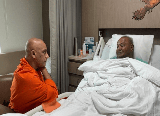 ಆದಿಚುಂಚನಗಿರಿ ಮಠದ ನಿರ್ಮಲಾನಂದನಾಥ ಸ್ವಾಮೀಜಿ ಇಂದು ಬೆಂಗಳೂರಿನ ಮಣಿಪಾಲ ಆಸ್ಪತ್ರೆಗೆ ಆಗಮಿಸಿದ್ದರು. ಅಲ್ಲಿ ಚಿಕಿತ್ಸೆ ಪಡೆಯುತ್ತಿರುವ ಮಾಜಿ ಪ್ರಧಾನಿ ಹೆಚ್ಡಿ ದೇವೇಗೌಡರ ಆರೋಗ್ಯ ವಿಚಾರಿಸಿದ್ರು. ದೇವೇಗೌಡರ ಬಳಿ ಕುಳಿತು ಸ್ವಲ್ಪ ಹೊತ್ತು ಮಾತನಾಡಿದ ಸ್ವಾಮೀಜಿ, ದೇವೇಗೌಡರಿಗೆ ಧೈರ್ಯ ತುಂಬಿದ್ರು. ಶೀಘ್ರ ಚೇತರಿಕೆಗೆ ಶುಭ ಹಾರೈಸಿದ್ರು. ಈ ವೇಳೆ ದೇವೇಗೌಡರು ನಗು ನಗುತ್ತಲೇ ಸ್ವಾಮೀಜಿ ಜೊತೆ ಮಾತನಾಡಿದ್ರು. ಬಳಿಕ ವೈದ್ಯರಿಂದ ದೇವೇಗೌಡರ ಆರೋಗ್ಯದ ಬಗ್ಗೆ ಮಾಹಿತಿ ಪಡೆದ್ರು.