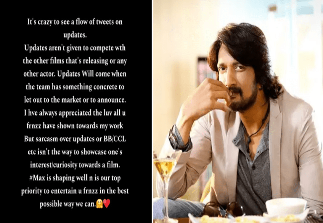 ಇಂತಾದ್ದೊಂದು ಸ್ಟೇಟಸ್ ಹಾಕಿಕೊಳ್ಳೋ ಮೂಲಕ ಕಿಚ್ಚ ಸುದೀಪ್ ಬೇರೆಯದೇ ರೀತಿಯ ಅಪ್ʻಡೇಟ್ ಕೊಟ್ಟಿದ್ಧಾರೆ. ಮ್ಯಾಕ್ಸ್ ಚಿತ್ರದ ಅಪ್ʻಡೇಟ್ ಏನಾದರೂ ಇದ್ದರಷ್ಟೇ ಕೊಡಬೇಕು. ಇಲ್ಲದೇ ಹೋದರೆ ಏನು ಮಾಡೋದು ಅನ್ನೋದು ಸುದೀಪ್ ಪ್ರಶ್ನೆ.