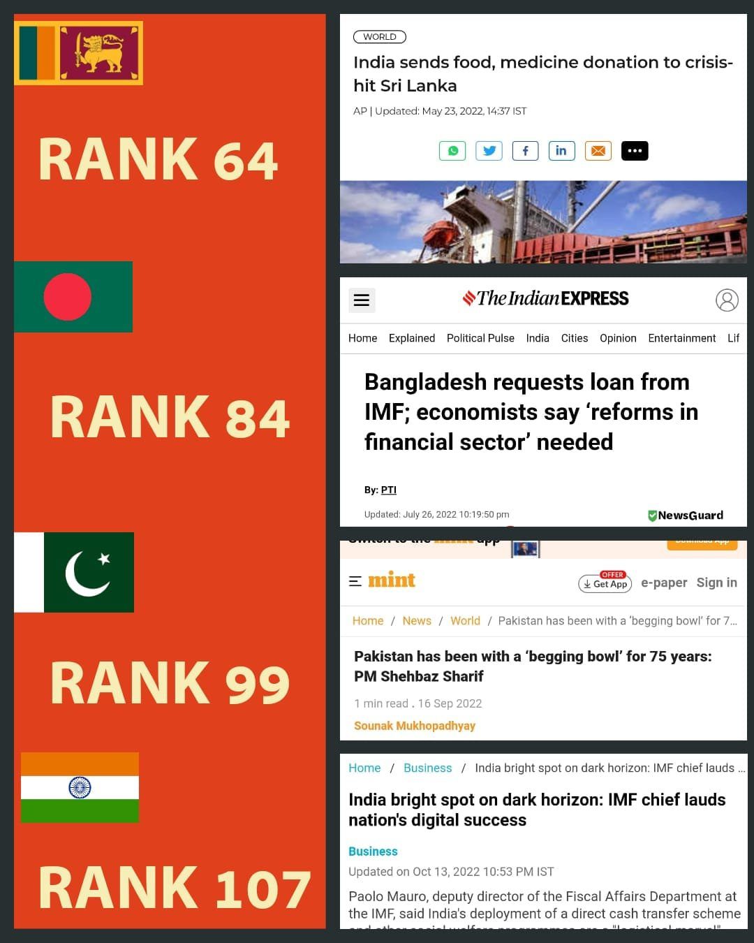 ದೇಶದಲ್ಲಿ ಆರ್ಥಿಕತೆ ಅದೋಗತಿಯಲ್ಲಿರುವ ಪ್ರವಾಹ ಪರಿಸ್ಥಿತಿಯಲ್ಲಿ ಸಂತ್ರಸ್ತರಿಗೆ ಊಟ ಕೊಡುವುದಕ್ಕೂ ಪರದಾಡುತ್ತಿರುವ, ದೇಶಕ್ಕೆ ದೇಶವೇ ನೆರವಿಗಾಗಿ ಅಂಗಲಾಚುತ್ತಿರುವ, ಕತ್ತೆ, ಎಮ್ಮೆಗಳನ್ನು ಮಾರಿ ಬದುಕುತ್ತಿರುವ ಪಾಕಿಸ್ತಾನಕ್ಕೆ 99ನೇ ಸ್ಥಾನ. ಬಾಂಗ್ಲಾದೇಶದಂತಾ ಬಾಂಗ್ಲಾದೇಶ ಕೂಡಾ 84ನೇ ಸ್ಥಾನ. ಭಾರತದ ನೆರವಿಲ್ಲದೆ ಹೋಗಿದ್ದರೆ ಬದುಕು ನರಕವಾಗುತ್ತಿತ್ತು ಎನ್ನುತ್ತಿರುವ ನೇಪಾಳಕ್ಕೆ 81ನೇ ಸ್ಥಾನ. ದೇಶಕ್ಕೆ ದೇಶವೇ ಭಿಕಾರಿಯಾಗಿ, ದಿವಾಳಿಯಾಗಿರುವ, ಔಷಧಕ್ಕೂ ಬೇಡುವ ಪರಿಸ್ಥಿತಿಯಿರುವ ಶ್ರೀಲಂಕಾಕ್ಕೆ 64ನೇ ಸ್ಥಾನ. ಈ ಎಲ್ಲ ದೇಶಗಳ ಆರ್ಥಿಕತೆಗೂ, ಸಂಕಷ್ಟಗಳಿಗೂ ನೆರೆಹೊರೆಯ ರಾಷ್ಟ್ರ ಎಂಬಂತೆ ಸ್ಪಂದಿಸಿರುವ, ಅಷ್ಟೂ ದೇಶಗಳಿಗೆ ನೆರವು ನೀಡಿರುವ ಭಾರತಕ್ಕೆ 107ನೇ ಸ್ಥಾನ.