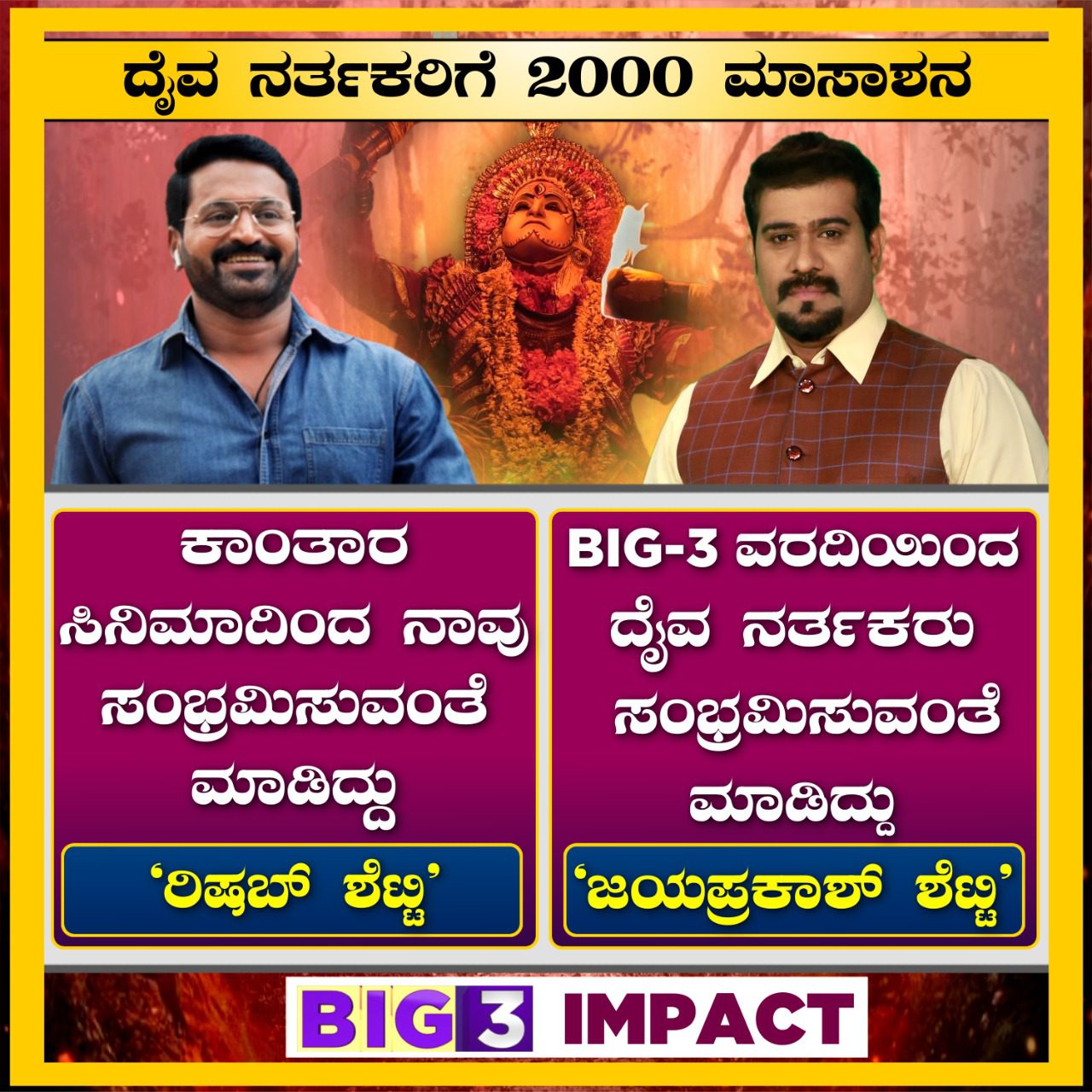 ಕಾಂತಾರಾದ ರಿಷಬ್ ಶೆಟ್ಟಿ ಮತ್ತು ಸುವರ್ಣ ನ್ಯೂಸ್ನ ಬಿಗ್ 3 ಜಯಪ್ರಕಾಶ್ ಶೆಟ್ಟಿ. ಬಿಗ್ 3 ಶೋನಲ್ಲಿ ದೈವನರ್ತಕರ ಸಮಸ್ಯೆಗಳನ್ನು ಸವಿಸ್ತಾರವಾಗಿ ತೋರಿಸಲಾಗಿತ್ತು. ಸಚಿವರ ಗಮನಕ್ಕೆ ತಂದು ಮನವಿ ಮಾಡಲಾಗಿತ್ತು. ಸಚಿವ ಸುನಿಲ್ ಕುಮಾರ್ ಕೂಡಾ ಸ್ಪಂದಿಸಿದ ನಂತರ ಕಾರ್ಯಕ್ರಮ ಮುಗಿಯವ ಹೊತ್ತಿಗೆ ಸರ್ಕಾರದ ಆದೇಶವೂ ಬಂತು. ಹೀಗಾಗಿ ಇಬ್ಬರು ಶೆಟ್ರಿಗೂ ದೈವನರ್ತಕರು ಹಾಗೂ ಕರಾವಳಿಯ ಜನ ಅಭಿನಂದನೆ ಸಲ್ಲಿಸುತ್ತಿದ್ದಾರೆ.