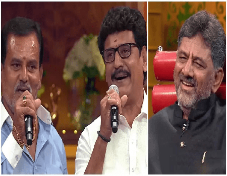 ‘ಏನ್ ಚಂದ ಕಾಣಿಸ್ತಾಳೆ ನಮ್ಮ ಖೋಡೆ ರಮ್ಮವ್ವ..’ ಹಾಡನ್ನು ಹಾಡಿದ್ದ ಅವರಿಬ್ಬರ ಹೆಸರು ಕಾಂತರಾಜು ಮತ್ತು ಪರಮೇಶ್. ಇವರಿಬ್ಬರು ಡಿಕೆ ಶಿವಕುಮಾರ್ ಅವರ ಸಹೋದರ ಸಂಬಂಧಿಗಳು. ವೀಕೆಂಡ್ ವೇದಿಕೆ ಮೇಲೆ ಶಿವಕುಮಾರ್ ಬಗ್ಗೆ ಮಾತನಾಡಿದ ಅವರಿಗೆ ರಮೇಶ್, ‘ಖೋಡೆ ರಮ್ಮವ್ವ..’ ಹಾಡನ್ನು ಹಾಡುವಂತೆ ಮನವಿ ಮಾಡಿದರು. ಕಾಂತರಾಜು ಮತ್ತು ಪರಮೇಶ್ ಮತ್ತೊಮ್ಮೆ ವೈರಲ್ ಹಾಡನ್ನು ಹಾಡಿ, ಅಲ್ಲಿದ್ದವರನ್ನು ರಂಜಿಸಿದರು. ಹಾಡು ಕೇಳಿ ಶಿವಕುಮಾರ್ ಕೂಡ ನಕ್ಕರು.