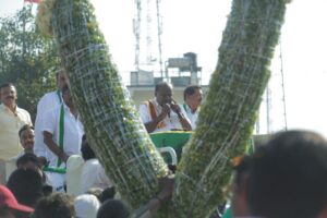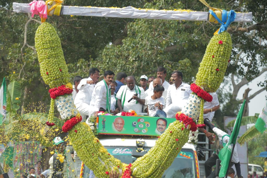 ನಾಯಕರು ಹೋದರೆ ಹೂವಿನ ಹಾರ ಹಾಕುವುದು ಮಾಮೂಲಿ. ಈಗ ಕೆಜಿಗಟ್ಟಲೆ ಹಾರ ಹಾಕುವುದು ಕೂಡಾ ಸಾಮಾನ್ಯ. ಜೊತೆಗೆ ಸೇಬಿನ ಹಾರ, ಕೊಬ್ಬರಿ ಹಾರ, ಮಲ್ಲಿಗೆ ಹಾರ, ಬಾದಾಮಿ ಖರ್ಜೂರಗಳಂತಾ ಡ್ರೈಫ್ರೂಟ್ಸ್ ಹಾರವೂ ಆಗಾಗ್ಗೆ ಕಂಡು ಬರುತ್ತದೆ. ಆದರೆ ಕುಮಾರಸ್ವಾಮಿ ಹಾರಗಳಲ್ಲಿಯೇ ಒಂದು ವಿಶೇಷ ಸಂದೇಶ ಕೊಟ್ಟಿದ್ದಾರೆ. ಚಿಕ್ಕಬಳ್ಳಾಪುರದ ಪೋಶೆಟ್ಟಿ ಹಳ್ಳಿಯಲ್ಲಿ ಹೂವು ಮತ್ತು ಸೇಬಿನ ಹಾರದ ಸ್ವಾಗತ ಸಿಕ್ಕರೆ, ತಿಪ್ಪೇನಹಳ್ಳಿ ಗ್ರಾಮದಲ್ಲಿ ಹೆಚ್ಡಿಕೆಗೆ ಸಿಕ್ಕಿದ್ದು ದೊಣ್ಣೆ ಮೆಣಸಿಕಾಯಿ/ಬಜ್ಜಿ ಮೆಣಸಿನ ಕಾಯಿ/ಕ್ಯಾಪ್ಸಿಕಂ ಹಾರ. ಕ್ಯಾಪ್ಸಿಕಂ ಆ ಊರಿನ ರೈತರ ಪ್ರಮುಖ ಬೆಳೆಯೂ ಹೌದು. ಸ್ವಾಗತದಲ್ಲಿ ಹೆಣ್ಣು ಮಕ್ಕಳು ಊರಿಗೆ ರಂಗೋಲಿ ಹಾಕಿ ಕುಂಭ ಕಳಶಗಳೊಂದಿಗೆ ಸ್ವಾಗತ ಕೋರುತ್ತಿದ್ದರೆ, ರೈತ ಮಕ್ಕಳದ್ದು ಕುಮಾರಣ್ಣಂಗೇ ಜೈ ಎಂಬ ಜಯಘೋಷ. ಕಾರಹಳ್ಳಿ ಎಂಬ ಗ್ರಾಮದಲ್ಲಿ ಕುಮಾರಸ್ವಾಮಿಗೆ ಸಿಕ್ಕಿದ್ದು ಚಕ್ಕೋತ ಹಣ್ಣಿನ ಹಾರ. ಹುಲಿವೇಷ, ಕಳಸ ಹೊತ್ತ ಮೆರವಣಿಗೆ. ದೇವನಹಳ್ಳಿ ಕ್ಷೇತ್ರದ ವೆಂಕಟಗಿರಿಯಲ್ಲಿ ದ್ರಾಕ್ಷಿ ಹಣ್ಣಿನ ಹಾರ. ಈ ಊರಿನಲ್ಲಿ ದ್ರಾಕ್ಷಿಯೇ ಇಲ್ಲಿನ ರೈತರ ಜೀವ ಮತ್ತು ಜೀವನ. ಬಿಜ್ಜವಾರದಲ್ಲಿಯೂ ಕುಮಾರಸ್ವಾಮಿಗೆ ಸಿಕ್ಕಿದ್ದು ಬಜ್ಜಿ ಮೆಣಸಿನಕಾಯಿ ಹಾರದ ಸ್ವಾಗತ. ಕೆಲವು ರೈತರು ಹೊಂಬಾಳೆಯನ್ನೇ ಕಾಣಿಕೆಯಾಗಿ ಕೊಟ್ಟು ಧನ್ಯರಾಗಿದ್ದೂ ವಿಶೇಷ. ತುಳಸಿಯ ಹಾರ ಒಂದೆಡೆಯಾದರೆ, ಹಲವು ಕಡೆ ಸೇಬು ಹಣ್ಣಿನ ಹಾರದ ಸ್ವಾಗತವಿತ್ತು. ನೆಲಮಂಗಲ ಸೇರಿದಂತೆ ಕೆಲವೆಡೆ ರಾಗಿತೆನೆಯ ಹಾರ.. ಇನ್ನೂ ಕೆಲವೆಡೆ ಮುಸುಕಿನ ಜೋಳದ ಹಾರ…