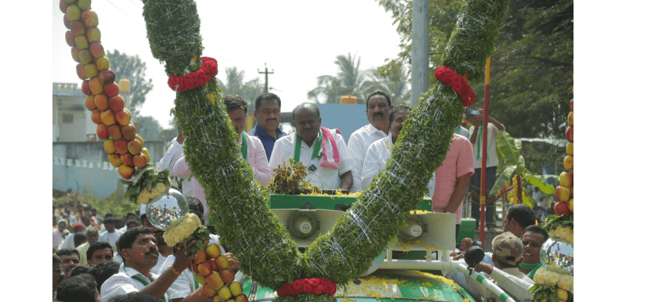 ಇಡೀ ಯಾತ್ರೆಯಲ್ಲಿ ಗಮನ ಸೆಳೆದಿದ್ದು ಅಭಿಮಾನಿಗಳು ಹಾಕುತ್ತಿರುವ ಹಾರಗಳು. ಕಳೆದ ಬಾರಿಯ ಚುನಾವಣೆಯಲ್ಲಿ ಕ್ರೇನುಗಳ ಮೂಲಕ ಹಾರ ಹಾಕುವ ಕಲ್ಪನೆಯನ್ನು ಜಾರಿಗೆ ತಂದಿದ್ದವರೇ ಜೆಡಿಎಸ್ ಕಾರ್ಯಕರ್ತರು. ಈಗ ಅದು ಟ್ರೆಂಡ್ ಆಗಿರಬಹುದು, ಆದರೆ ಮಂಡ್ಯದಲ್ಲಿಯೇ ಬೃಹತ್ ಹಾರ ಹಾಕುವ ಕಲ್ಪನೆಗೆ ಜೀವ ತುಂಬಿದ್ದು. ಇದಾದ ಮೇಲೆ ಹಾರಗಳ ಮೂಲಕವೇ ಇದು ರೈತರ ಪಕ್ಷ ಎಂಬ ಸಂದೇಶವನ್ನು ಜನ ಹಾಗೂ ಕುಮಾರಸ್ವಾಮಿ ಪದೇ ಪದೇ ನೀಡುತ್ತಿದ್ದಾರೆ. ಸೇಬು, ಕಿತ್ತಳೆ, ಮಲ್ಲಿಗೆ ಹೂವುಗಳ ಹಾರಗಳ ಜೊತೆಗೆ ಕೊಬ್ಬರಿ, ತೆಂಗಿನ ಕಾಯಿ, ಮೆಣಸಿನಕಾಯಿ, ಕ್ಯಾಪ್ಸಿಕಂ, ಕೊತ್ತಂಬರಿ ಸೊಪ್ಪು, ಸೀಬೆ ಹಣ್ಣು, ಕ್ಯಾರೆಟ್, ಬೀಟ್ರೂಟ್, ದಾಳಿಂಬೆ, ಕಬ್ಬು, ರಾಗಿ ತೆನೆ, ಭತ್ತದ ತೆನೆ, ಬಾಳೆಕಾಯಿ, ಬೆಲ್ಲ, ಚಕ್ಕೋತಾ.. ಹೀಗೆ ಹಲವು ರೀತಿಯ ವಿಭಿನ್ನ ವಿಭಿನ್ನ ಹಾರಗಳನ್ನು ಹಾಕುತ್ತಿದ್ದಾರೆ. ಎಲ್ಲ ಹಾರಗಳನ್ನೂ ಅಷ್ಟೇ ಪ್ರೀತಿಯಿಂದ ಹಾಕಿಸಿಕೊಂಡಿರುವ ಕುಮಾರಸ್ವಾಮಿ, ರುದ್ರಾಕ್ಷಿ ಹಾರಕ್ಕೆ ಮಾತ್ರ ಒಲ್ಲೆ ಎಂದಿದ್ದಾರೆ.