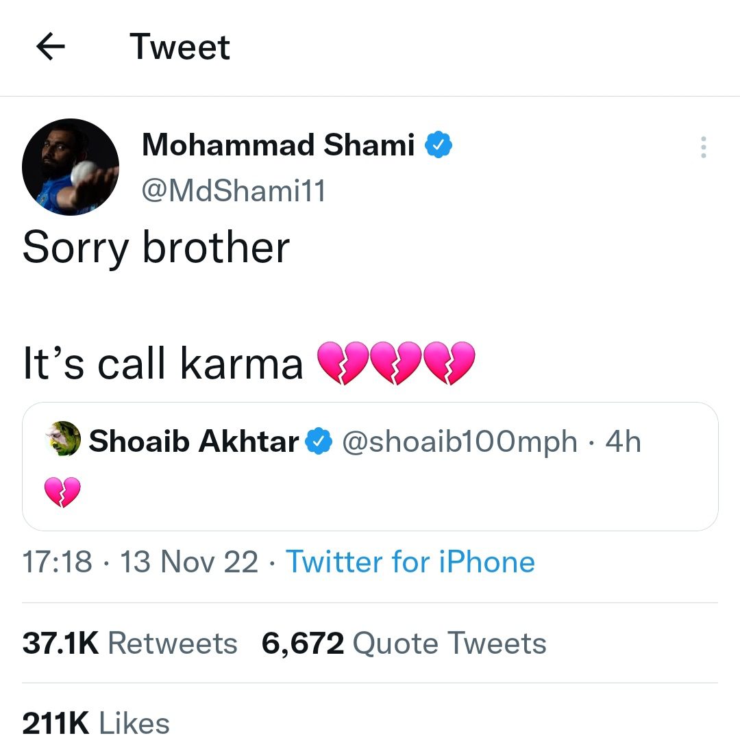 ಪಾಕಿಸ್ತಾನ ಸೋತ ನಂತರ ಶಮಿ ಅವರು ಶೋಯೆಬ್ ಅಖ್ತರ್ ಅವರಿಗೆ ಸಾರಿ ಬ್ರದರ್, ಇಟ್ಸ್ ಕಾಲ್ ಕರ್ಮ ಎಂದು ಟ್ವೀಟ್ ಮಾಡಿದ್ದರು. ಒಬ್ಬ ಆಟಗಾರನಾಗಿ ಈ ರೀತಿ ಮಾಡುವುದು ಕ್ರೀಡಾ ಮನೋಭಾವಕ್ಕೆ ವಿರುದ್ಧ ಎಂದು ವಾದಿಸುವವರಿದ್ದಾರೆ. ಆದರೆ ಶೋಯೆಬ್ ಅಖ್ತರ್ ಹಾಗೂ ಇತ್ತೀಚೆಗೆ ಪಾಕ್ ಕ್ರಿಕೆಟ್ ಪ್ರೇಮಿಗಳು ಶಮಿಯನ್ನು ವಿನಾಕಾರಣ ವಿವಾದಕ್ಕೆ ಸಿಲುಕಿಸಿದ್ದು ಹಾಗೂ ವಿನಾಕಾರಣ ಶಮಿ ಉತ್ತರ ಕೊಡುವ ಪರಿಸ್ಥಿತಿ ಎದುರಾಗಿದ್ದನ್ನು ಖುದ್ದು ಶಮಿ ಮರೆತಿರಲಿಕ್ಕಿಲ್ಲ.